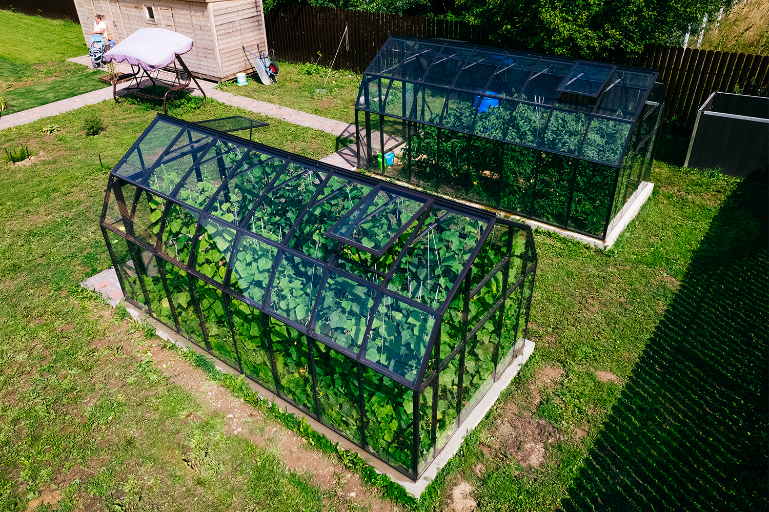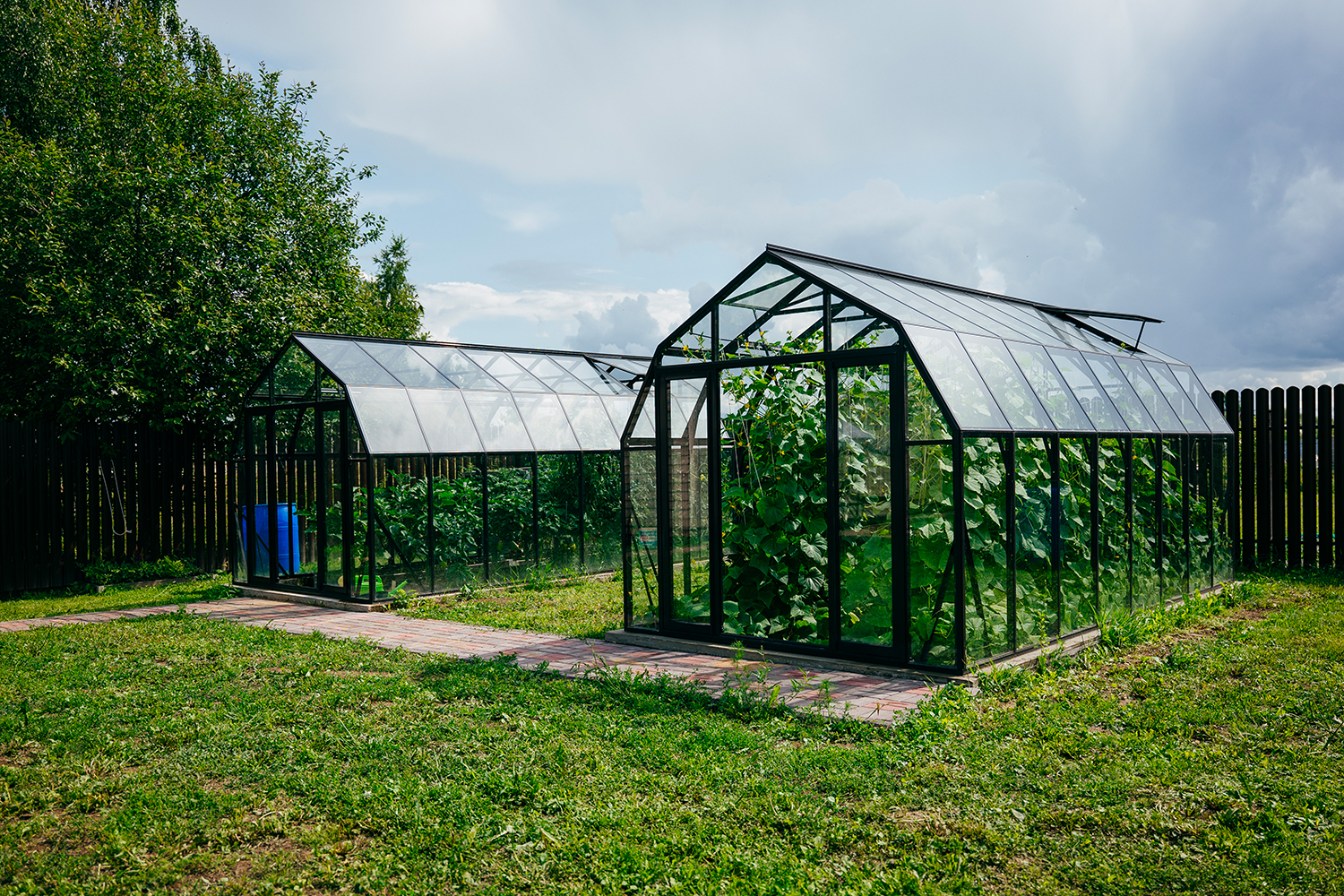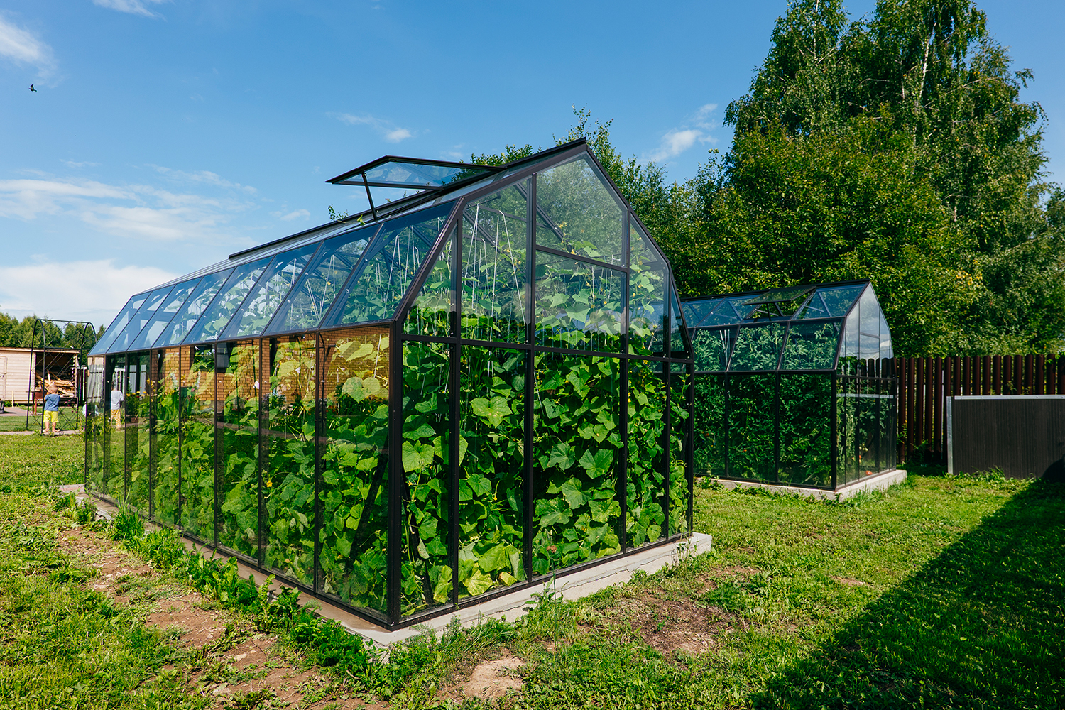 Две теплицы КРИСТАЛИКА Классик – выверенная архитектура и уверенная конструкция. Чёткая геометрия формирует гармоничную композицию на участке, а продуманное решение обеспечивает стабильность и надёжность в эксплуатации.